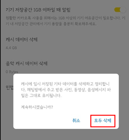 이 메뉴를 클릭하면, 그간에 대화창에서 주고 받았던 사진이나 동영상, 음성메세지 파일을 그대로 유지된다고 안내 메세지가 나오며, 임시 저장된 기타 데이터를 삭제하고 정리한다고 합니다. 모두 삭제 버튼을 누른다면, 카카오톡 내에 있던 불필요한 캐시 삭제가 가능해집니다.