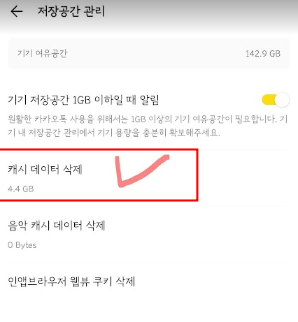 위 안내 드린 것처럼 메인 화면을 진입 후 상단 톱니바퀴 모양의 아이콘이 있습니다. 이를 클릭한다면, 여러 메뉴들 중에 가장 하단으로 내려보시면 앱관리 라는 메뉴가 보일겁니다. 이를 클릭한다면 [저장공간관리]를 클릭하여 캐시데이터를 삭제할 수 있습니다.