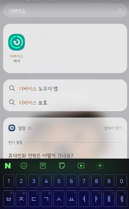 갤럭시 어플리케이션 모아져 있는 화면으로 들어가면, 맨 상단에 검색창을 입력할 수 있습니다. 이 곳에 [디바이스케어] 라고 검색하시면 갤럭시 자체 내에 있는 디바이스 보호해주는 어플리케이션이 실행됩니다.