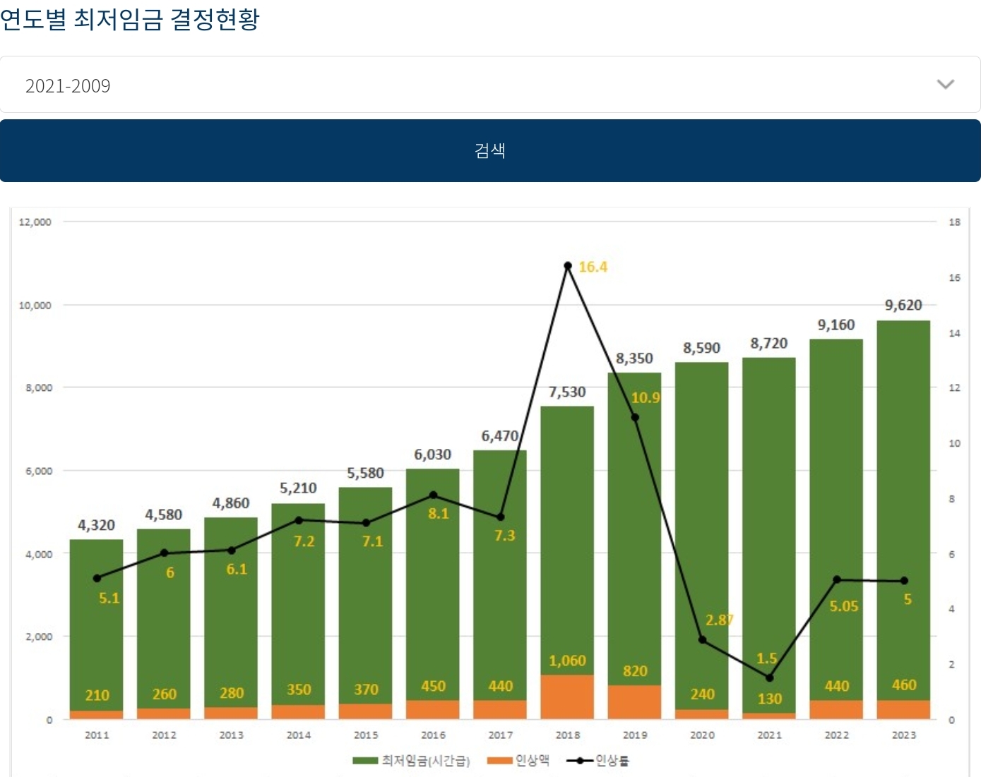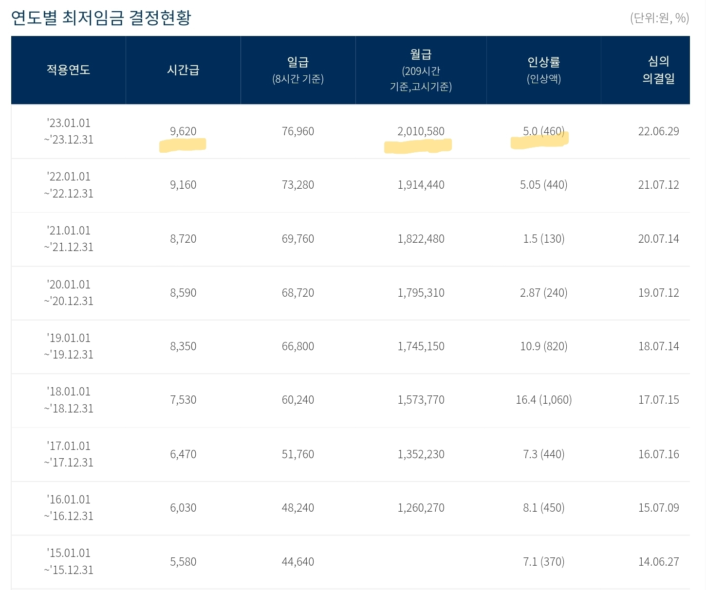 이에 따라 2023년도는 작년에 비해 5% 상승하여, 9,620원으로 최저 시급이 결정되었습니다.